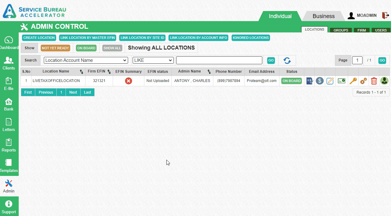 Editing a location will allow you to setup preparers in that location, update firm information,upload the EFIN summary, manage the location’s account settings and submit or modify bank enrollments.