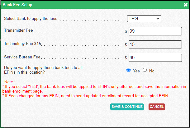 Set your Transmission and Service Bureau Fee here per location and by bank to lock these fees into the bank applications. If you do not set your Bank Fee before marking a location as paid the admin preparer can submit their bank enrollment with no additional transmitter fee or service bureau fee so be sure to do this!!