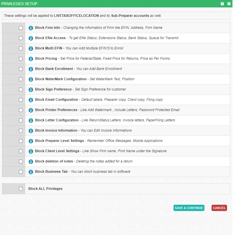 Privileges allow you to block access to particular features of your software per location (note this also effects the Admin Preparer account). Here is where you are able to prevent the Admin Preparer from submitting their Bank Enrollment should you so wish to do so.