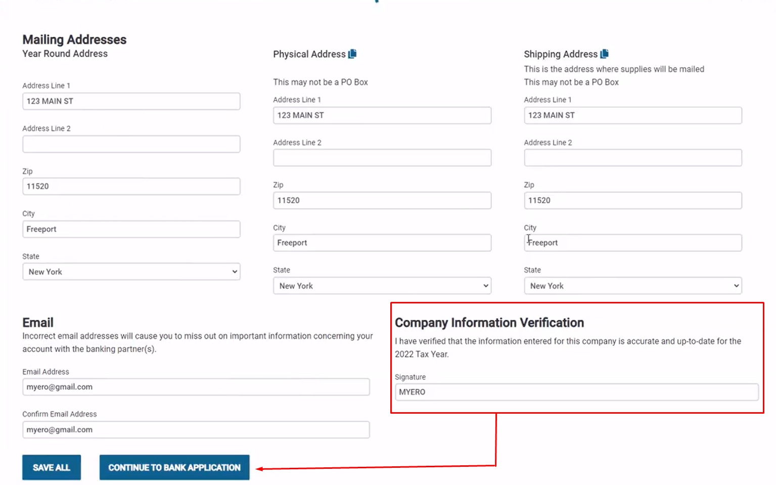Once opened, Scroll down and Enter a signature or Name in the Company Information Verification Section > Continue to Bank Application