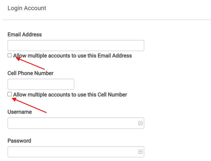 “Allow multiple accounts to use this Email Address” and “Allow multiple accounts to use this Cell Number.”